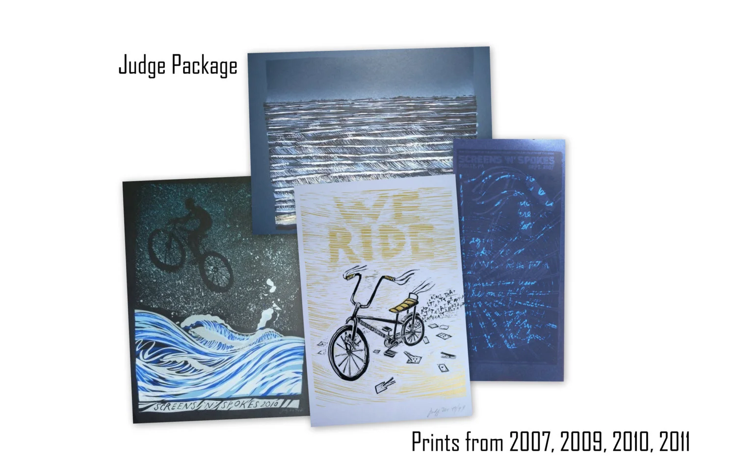 To celebrate Small Business Saturday, we are offering this Kathleen Judge print package for a limited time. You'll get one of each of Judge's 2007, 2009, 2010 and 2011 Screens 'N' Spokes prints. That's 4 great holiday presents, or keep them all for yourself, your walls will thank you for them.